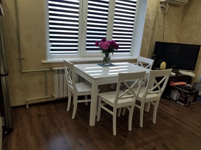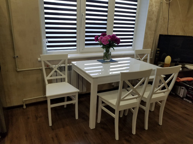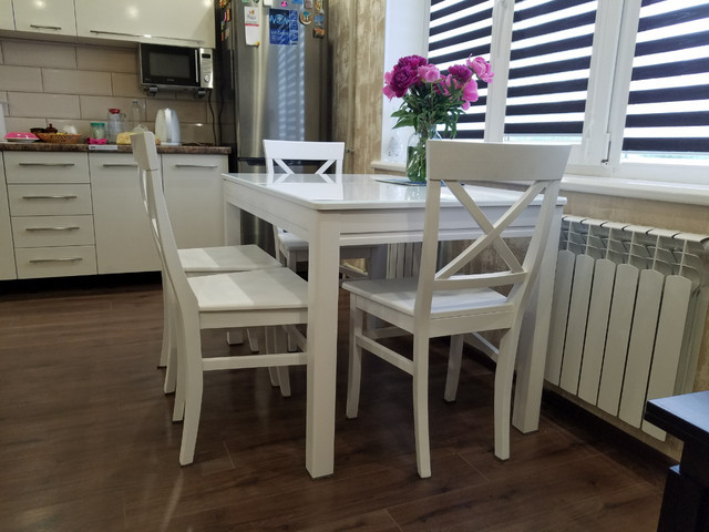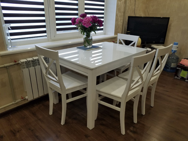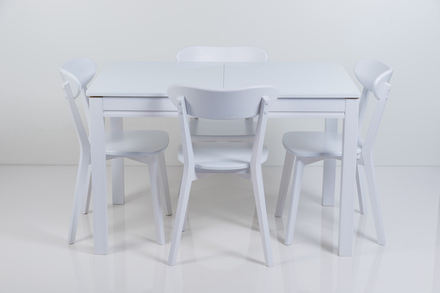 Специально для любителей белой мебели в стиле Икеа есть Одноцветный белый обеденный стол Сан-Ремо. Здесь все полностью белое. Можно укомплектовать стульями белого цвета из коллекции на нашем сайте.